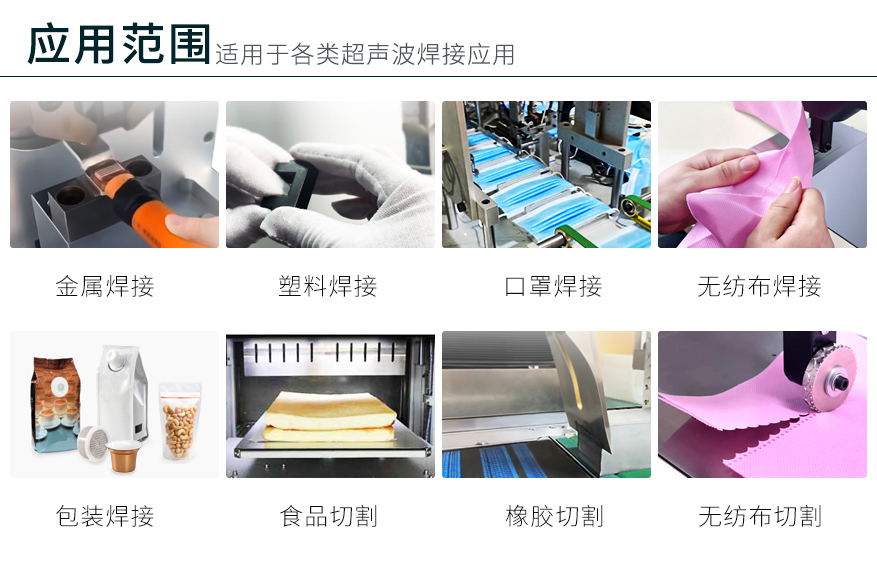 適用于各類超聲波焊接應(yīng)用。例如金屬焊接,塑料焊接,口罩焊接,無(wú)紡布焊接,無(wú)紡布切割,包裝焊接,食品切割,橡膠切割,超聲波萃取等。