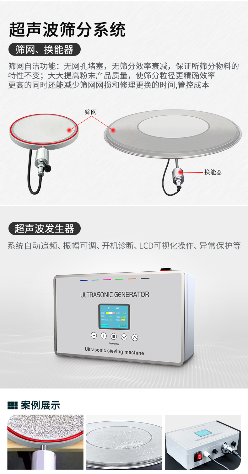 超聲波振動(dòng)篩是在普通振動(dòng)篩的基礎(chǔ)上增加的超聲波篩分系統(tǒng),可將電能輸入超聲波換能器,將其轉(zhuǎn)化為機(jī)械振動(dòng),其所產(chǎn)生的超聲波使篩網(wǎng)以高頻振動(dòng),高頻的振動(dòng)頻率可使細(xì)粉物料在篩網(wǎng)上形成微懸浮狀態(tài),能更快通過(guò)篩網(wǎng),不會(huì)產(chǎn)生靜電和貼在屏幕上,同時(shí)達(dá)到篩分和清網(wǎng)的效果防止堵塞。超聲波使篩面上的物料始終保持懸浮狀態(tài),從而解決粘附、摩擦、楔入等容易堵網(wǎng)的因素,從而解決了強(qiáng)吸附性、易團(tuán)聚、高靜電、高精細(xì)、高密度、輕比重等篩分難題,使超微細(xì)粉篩分不再成為難事,特別適合高品質(zhì)、精細(xì)粉體的用戶(hù)使用