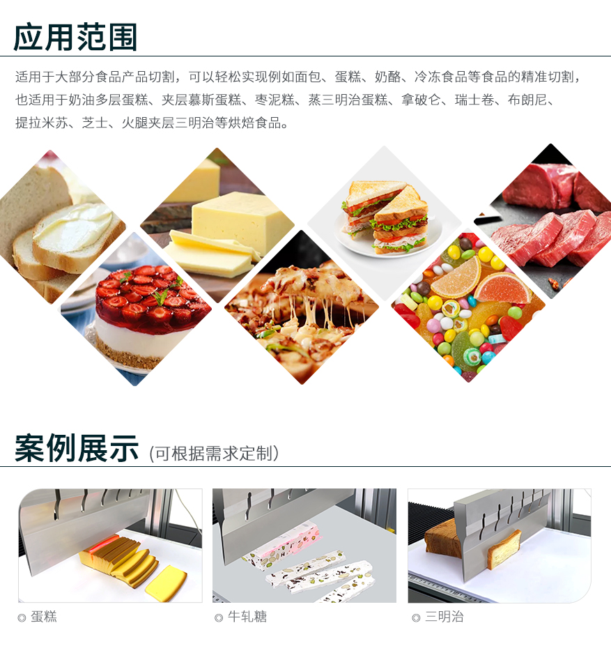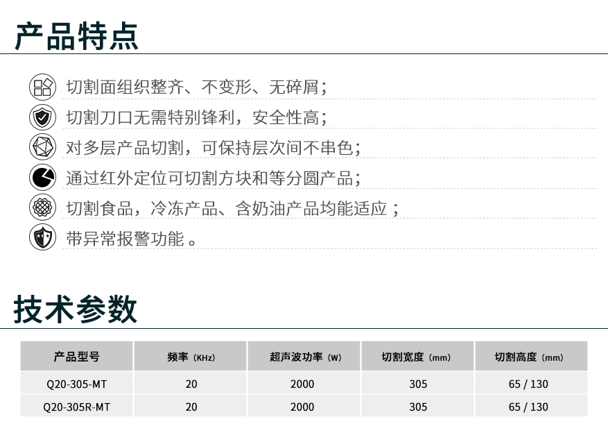 Q20-MT是一款手動超聲波食品切割設(shè)備。智能自動追頻發(fā)生器、大功率超聲波換能器、食品級鈦合金切割刀組成的超聲波核心部件。在食品切割方面有良好的表現(xiàn)。切割面組織整齊,無碎屑,美觀。適用于不同厚度及硬度的糕點(diǎn)食品,如奶酪,蛋糕和面包,披薩,牛軋?zhí)?、軟糖等食品?/dl>