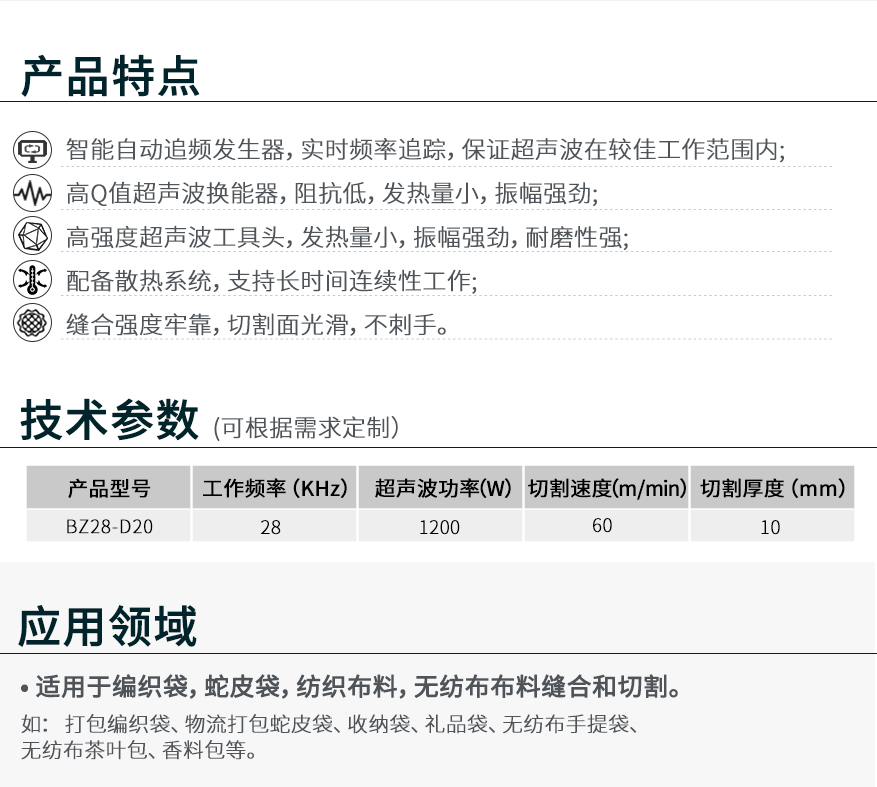 BZ28-D20編織袋切割系統(tǒng)是一款專門為編織袋縫合及切割的超聲波系統(tǒng)。智能自動追頻發(fā)生器、高Q值超聲波換能器以及切割工具頭在編制袋縫合及切割上有良好的表現(xiàn)。整機安裝簡單方便,縫合切割效率高,整機配備散熱系統(tǒng),可連續(xù)性工作。