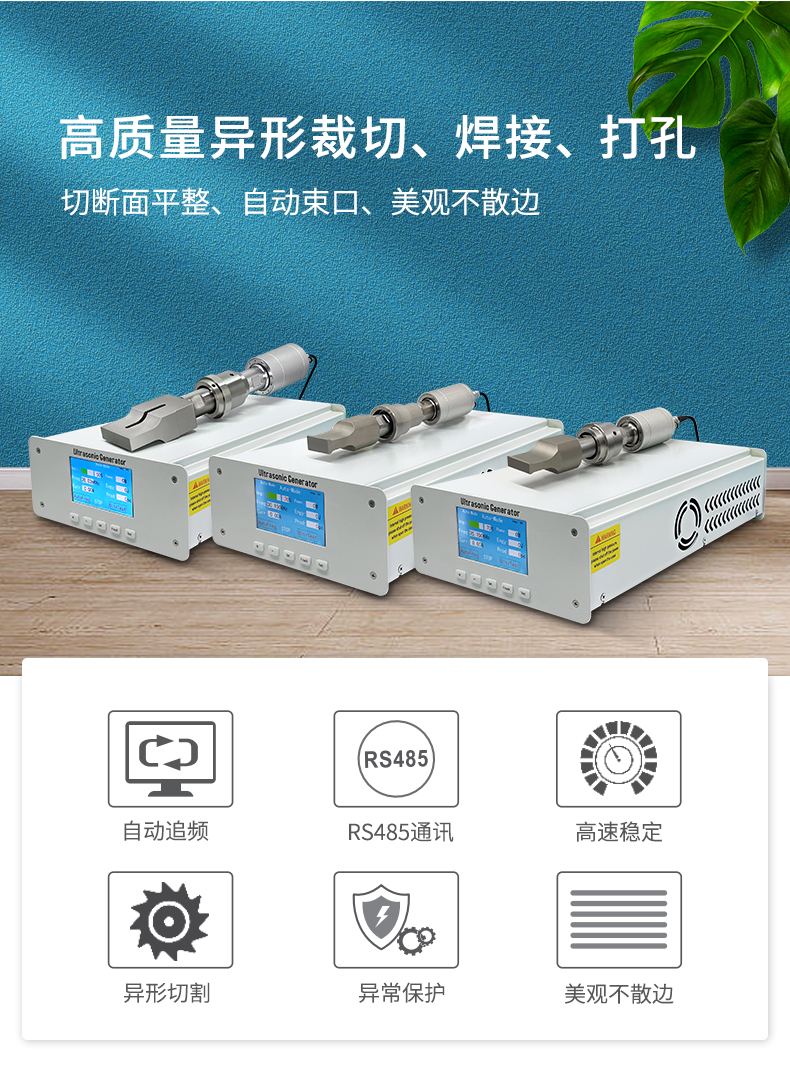 佳源達(dá)超聲波裁斷系統(tǒng)由超聲波發(fā)生器、換能器和工具頭組成,該系統(tǒng)擁有20KHz、30KHz、35KHz多款解決方案,能滿(mǎn)足不同的應(yīng)用場(chǎng)景需求。它采用自動(dòng)追頻超聲波發(fā)生器驅(qū)動(dòng),自動(dòng)跟蹤最佳諧振頻率,補(bǔ)償因發(fā)熱等原因造成的失諧,保證超聲波發(fā)生器、換能器、工具頭在最佳的工作狀態(tài);帶RS485通訊,可實(shí)現(xiàn)操作界面與超聲波發(fā)生器互聯(lián)通訊;大功率高Q值換能器、輸出功率強(qiáng)勁、工作穩(wěn)定;具備頻率、電流、功率、工具頭、換能器以及切割等多重異常保護(hù)功能,安全保障。