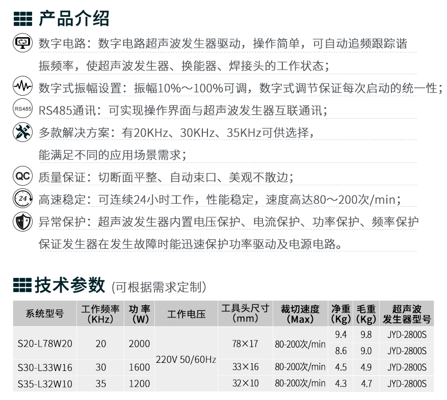 佳源達(dá)超聲波裁斷系統(tǒng)由超聲波發(fā)生器、換能器和工具頭組成,該系統(tǒng)擁有20KHz、30KHz、35KHz多款解決方案,能滿足不同的應(yīng)用場(chǎng)景需求。系統(tǒng)采用數(shù)字電路超聲波發(fā)生器驅(qū)動(dòng),操作簡單,可自動(dòng)追頻跟蹤最佳諧振頻率,保證超聲波發(fā)生器、換能器、焊接頭在最佳的工作狀態(tài);數(shù)字式振幅設(shè)置,振幅10%~100%可調(diào),數(shù)字式調(diào)節(jié)保證每次啟動(dòng)的統(tǒng)一性;帶RS485通訊,可實(shí)現(xiàn)操作界面與超聲波發(fā)生器互聯(lián)通訊;大功率高Q值換能器、輸出功率強(qiáng)勁、工作穩(wěn)定;超聲波發(fā)生器內(nèi)置電壓保護(hù)、電流保護(hù)、功率保護(hù)、頻率保護(hù)、保證超聲波發(fā)生器在