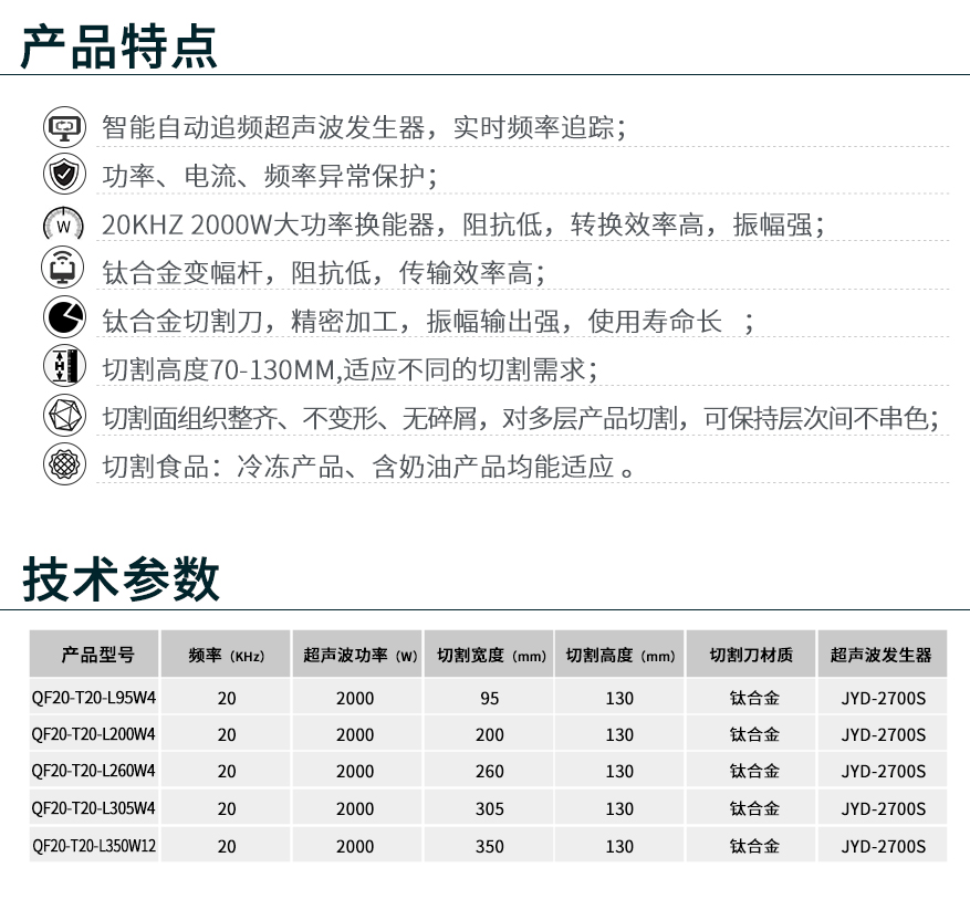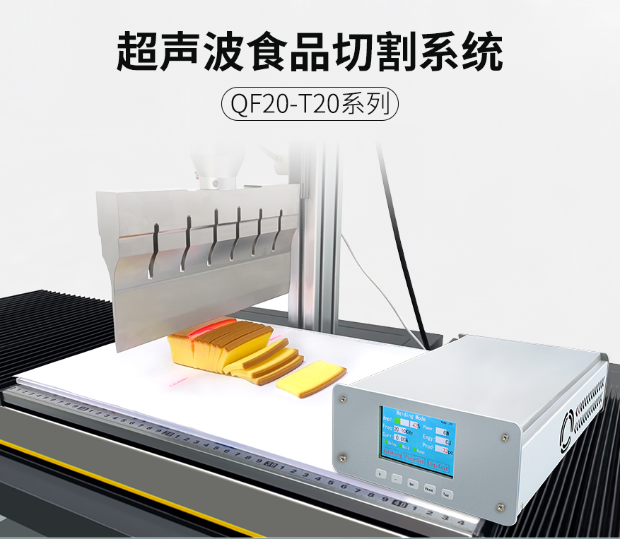 QF20-T20超聲波食品切割系統(tǒng)由自動追頻超聲波發(fā)生器、大功率超聲波換能器、鈦合金切割刀組成,在食品切割方面有良好的表現(xiàn)。整機安裝簡單方便,頻率實時跟蹤,振幅可調(diào),異常保護等;可通過PLC或RS485通訊控制。