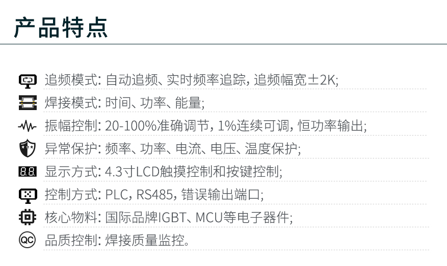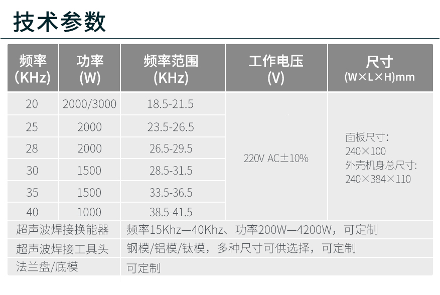 佳源達(dá)JYD-2700S是一款領(lǐng)先的自動(dòng)追頻超聲波焊接、切割應(yīng)用的超聲波發(fā)生器,大功率輸出,功率可調(diào)節(jié),自動(dòng)頻率追蹤,可選長(zhǎng)發(fā)波和短發(fā)波工作模式。
