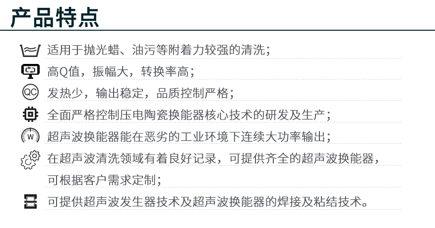 20Khz/25Khz/28Khz 超聲波清洗換能器適應(yīng)于拋光蠟,油污等附著力較強(qiáng)的清洗。高Q值,振幅大,轉(zhuǎn)換率高,發(fā)熱少,輸出穩(wěn)定,嚴(yán)格的質(zhì)量監(jiān)控。我們可以根據(jù)客戶的不同要求提供定制服務(wù)。