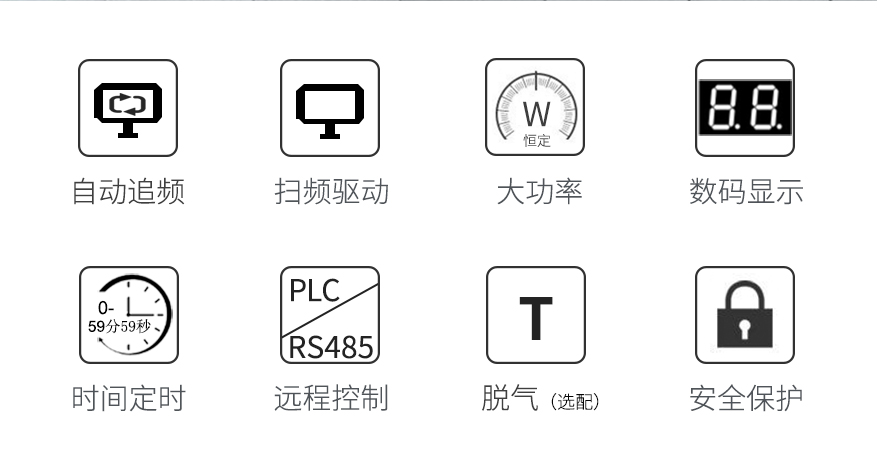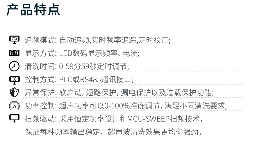 JYD-760超聲波發(fā)生器一鍵自動(dòng)追頻,恒功率輸出,防腐蝕設(shè)計(jì),領(lǐng)先的MCU-SWEEP掃頻技術(shù),保證換能器一直在最佳的工作狀態(tài)。LED顯示電流,頻率,定時(shí),增加RS485和PLC通訊接口。