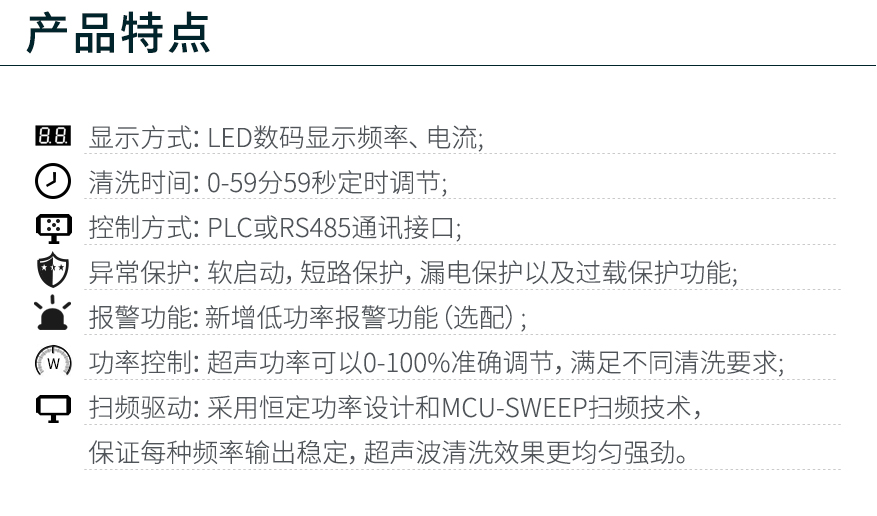 佳源達(dá)超聲波發(fā)生器 JYD-700F恒功率輸出,防腐蝕設(shè)計(jì),領(lǐng)先的MCU-SWEEP掃頻技術(shù),保證換能器一直在最佳的工作狀態(tài)。LED顯示電流,頻率,定時(shí),增加RS485和PLC通訊接口。