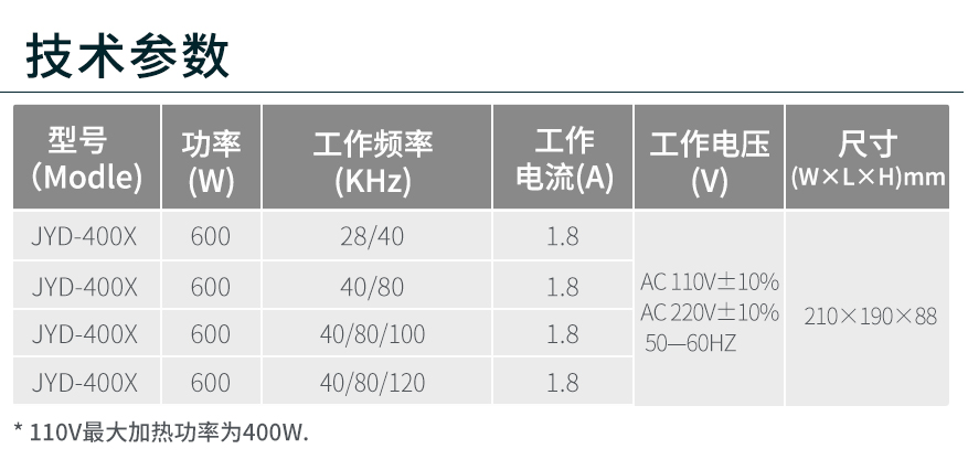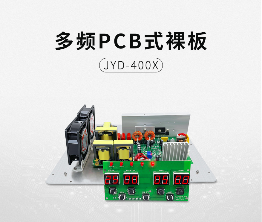 多頻PCB式超聲波發(fā)生器JYD-400X,軟啟動,集成加熱功能,過載保護(hù)功能;頻率可以根據(jù)不同的清洗要求進(jìn)行自動或手動切換。